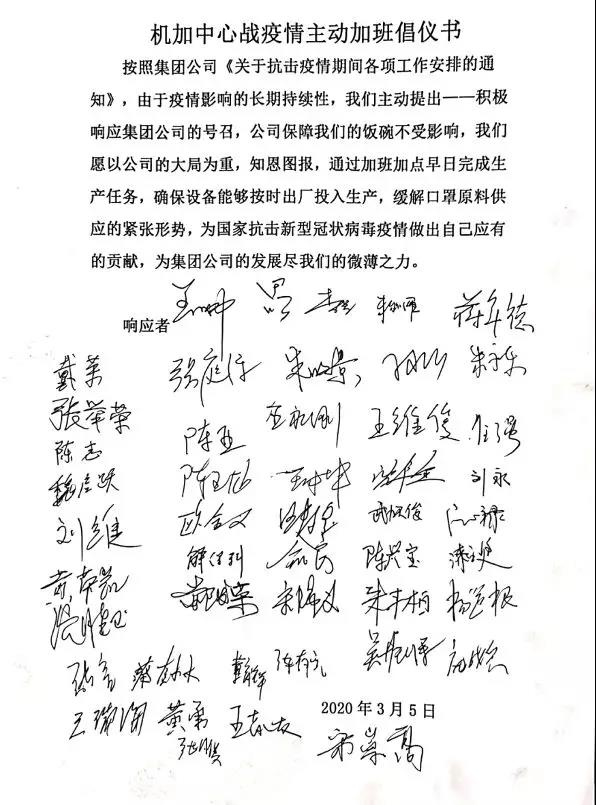 为确保生产设备第一时间交付到口罩原料生产企业,缓解口罩原料供应紧张形势。2020年3月5日,科亚生产系统机加工中心向集团公司递交《机加中心战疫情主动加班倡议书》,倡议书文字朴实,令人动容。